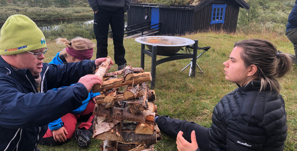 Deltakerne ble delt inn i to lag, Simen og Mads deltok som guider på hvert sitt lag. Oppgaven var å bygge et så høyt som mulig tårn av ved. Helst ved å bruke pagodebålteknikken. Dette krevde konsentrasjon og samhandling. Her hadde vi også mulighet til å lage oppgaven enda mer utfordrende ved å be deltakerne også kløyve veden. Begge lag leverte en meget god innsats. Etter måling fant vi ut at det var helt likt. Dermed fikk deltakere fra begge lag lov til å bygge et pagodebål i bålpannen før vi tente på. Vi gikk også igjennom de fire båltypene reflektorbål, pagodebål, pyramidebål og stjernebål. Deltakerne måtte nemlig huske på denne lærdommen før søndagens avsluttende sanseorientering. En herlig stemning rundt bålet med vannflasker og nøtteposen tilgjengelig :-)